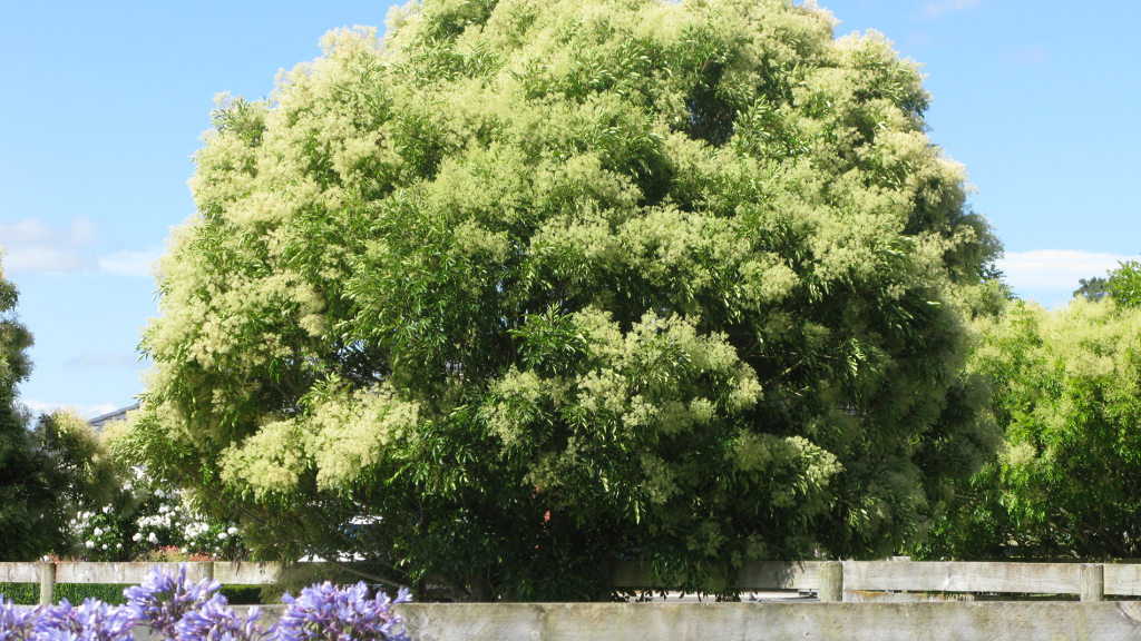 Small-to-large evergreen, hairless tree or dense shrub (<15+ m) with distinctive lumpy warts on the stems. Dark green leaves (5-13 x 3-6 cm) are glossy on the top surface and arranged in opposite pairs on the stems. Tiny fragrant, creamy flowers make up flowerheads (25 x 20 cm, Nov-Mar) and are followed by bluish or purplish-black berry-like fruit (6 x 5 mm) coated with a powdery ‘bloom’.
