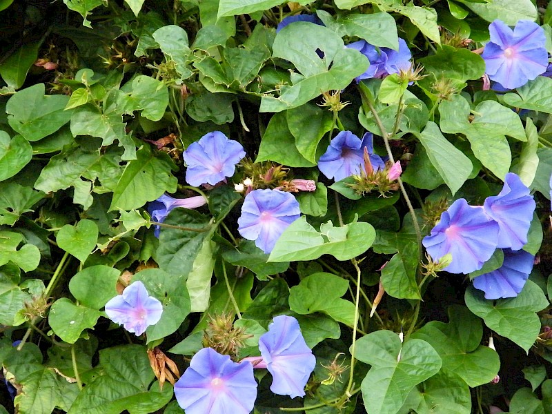 Exotic species: Purple morning glory (I. purpurea), great bindweed (Calystegia silvatica), field bindweed (Convolvulus arvensis). Native species include: railway creeper (I. cairica, I. palmate), pink bindweed or convolvulus (Calystegia sepium), shore bindweed (Calystegia soldanella) and Calystegia tuguriorum.