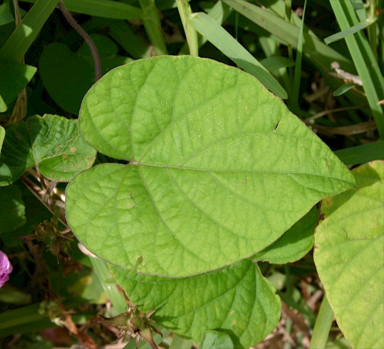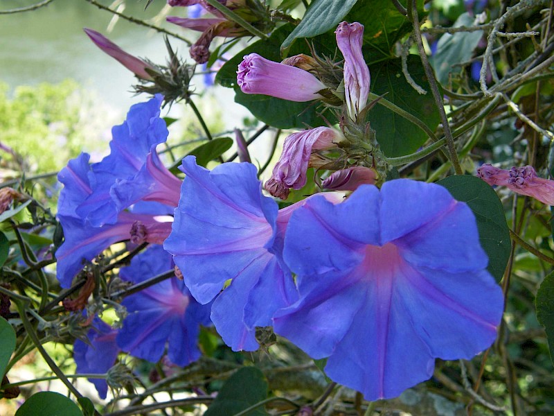 High climbing vine with tough, hairy, twining, running stems with tough fibrous roots without rhizomes. Leaves (5-18 x 5-16 cm) are usually 3-lobed and silky-hairy underneath. From late spring to early winter, groups of 3-12 deep blue-purple flowers that are pink at the base and wither in the midday sun are produced. Little or no seed is produced in New Zealand.