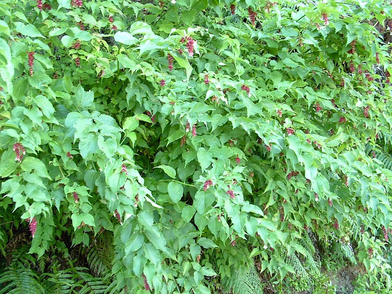 Few seeds produced are well dispersed by birds and water, and new plants quickly form dense thickets. Colonises light wells, slips and other gaps, quickly replacing native species that are trying to establish and causing invasion by other exotic species, especially vines by getting rid of native competition. Tolerates moderate to deep shade, frost, damage, damp, and most soils. Not long-lived, so eventually succeeded by other species.