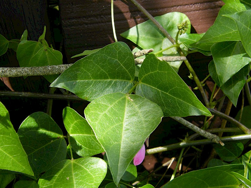 Evergreen, climbing vine with rounded, moderately hairy stems that are woody towards their base. Leaves are made up of three heart-shaped leaflets (25-55 mm long) that are not usually arranged in a flat plane. Pea-like white, lavender and white, or pink to reddish purple flowers (10-15 mm long) are produced from spring to summer, and develop into boat-shaped seed pods (30-40 mm long) that ripen and split to release the seeds.