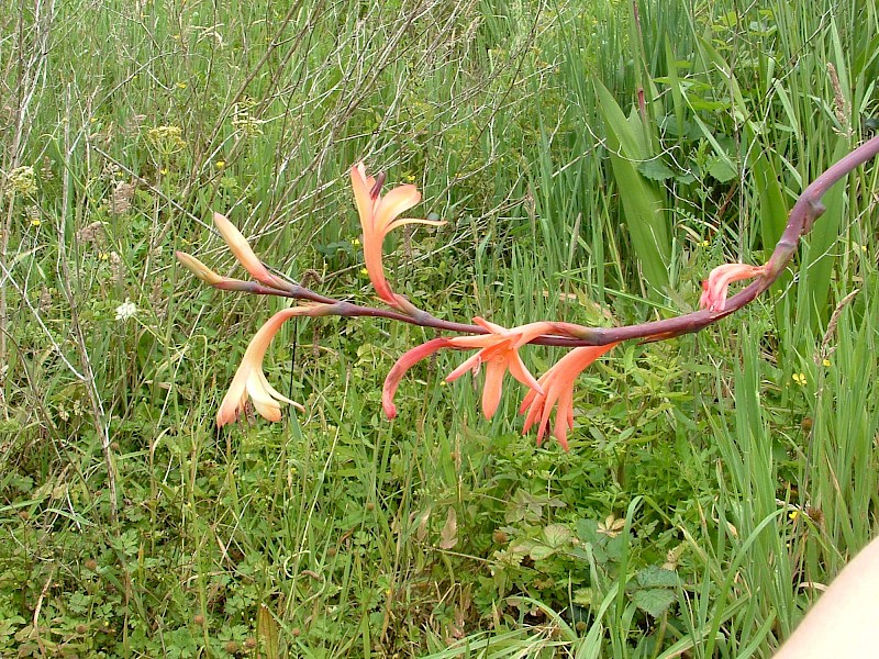 Similar to other Watsonia species, montbretia, and gladiolus, but is the only species with aerial corms. Flowers of garden cultivars can also be white, rose and pink.