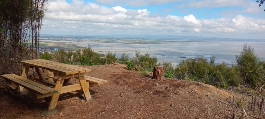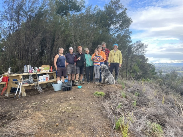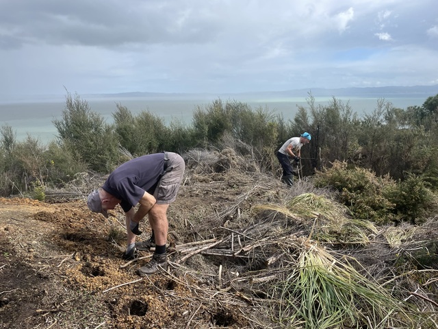 On 30th August 2025, a group of TEA members and public volunteers met at the lookout to replant it. We chose low and medium native grasses, including mapere (Gahnia setifolia), pukio (Carex virgata), wharariki (Phormium cookianum), some smaller bushes of Coprosma rhamnoides, and a rugged, prostrate Muelenbeckia axillaris which we hope will spread and cover most of the ground. Big thanks to Pare Hauraki for supplying most of the plants, to the generous donors for the money to buy them, and to everyone who put in the hard mahi on the day!